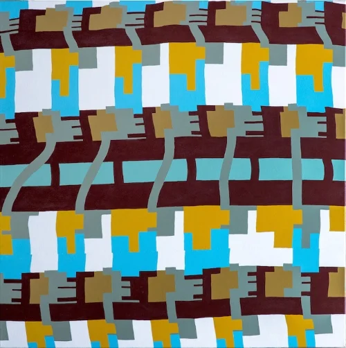 Eric's Legos, acrylic on patterned fabric, 30x30, 2016